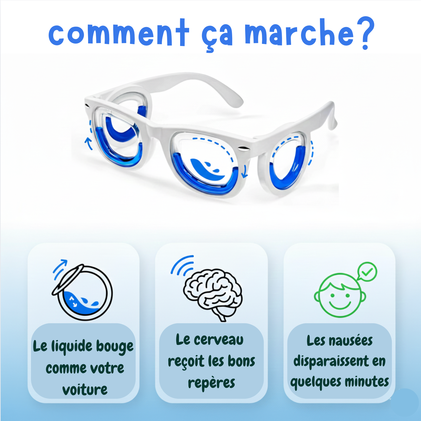 Elles se portent comme des lunettes classiques et restent très légères, ce qui les rend faciles à utiliser aussi bien pour les adultes que pour les adolescents. Les anneaux remplis de liquide situés à l’avant et sur les côtés créent un repère visuel supplémentaire, ce qui peut aider votre cerveau à mieux interpréter les mouvements. Beaucoup d’utilisateurs disent ressentir un apaisement ou une diminution de l’inconfort après quelques minutes d’utilisation, même si les effets peuvent varier d’une personne à l’autre.